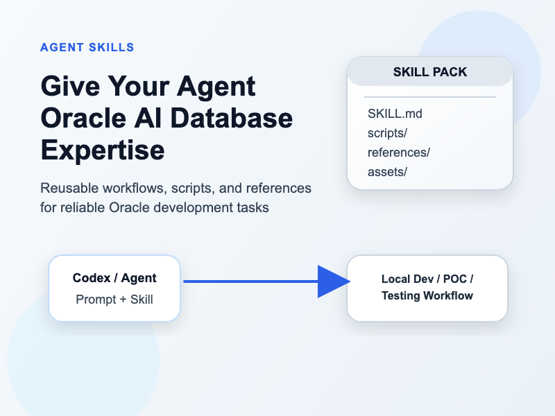 In this article, we’ll look at what skills are, how to install them, and how the open source oracle-db-skills repo can help your agents do real work with Oracle AI Database. You can even easily write or extend the existing skills on your own!